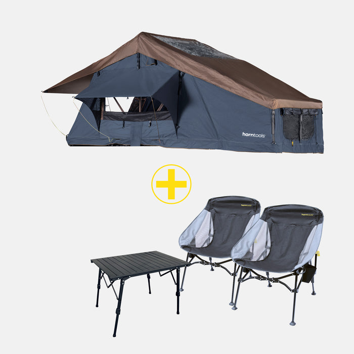 Avec l'Elements Ocean Bundle Bronze, tu combines notre tente de toit Elements Ocean éprouvée (disponible en différentes tailles) avec le set de meubles de camping horntools composé de deux chaises et d'une table de camping compacte.