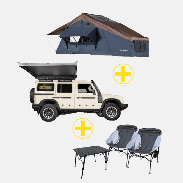 Avec l'Elements Ocean Bundle Gold, tu reçois notre robuste tente de toit Elements Ocean Gen 2 (disponible en différentes tailles), le store Straight ainsi que le set de meubles de camping horntools avec deux chaises et une table - un ensemble complet parfaitement adapté à un prix avantageux.