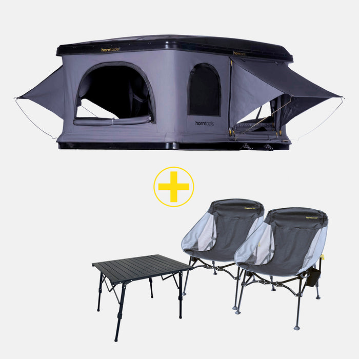 Avec le Themis Bundle Bronze, tu combines notre tente de toit Themis très appréciée (disponible en différentes tailles) avec le set de meubles de camping horntools de haute qualité composé de deux chaises pliantes et d'une table de camping stable.